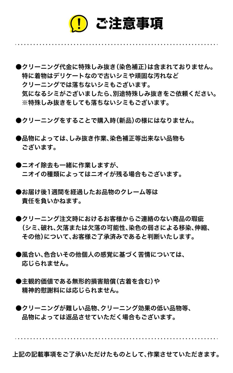 ※万一のクリーニングトラブルの際はクリーニング事故賠償基準に基づき適切にご対応させて頂きます。