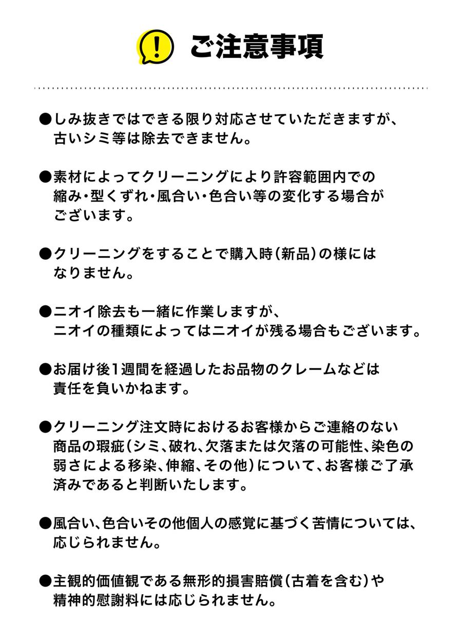 ※万一のクリーニングトラブルの際はクリーニング事故賠償基準に基づき適切にご対応させて頂きます。